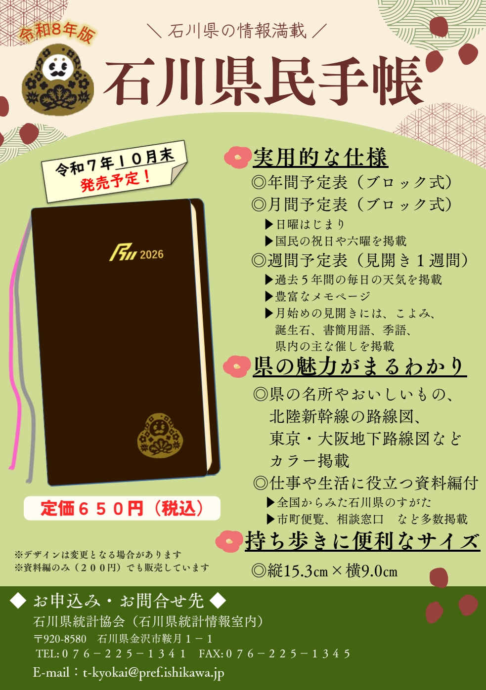 令和8年版 石川県民手帳 10月下旬販売予定!