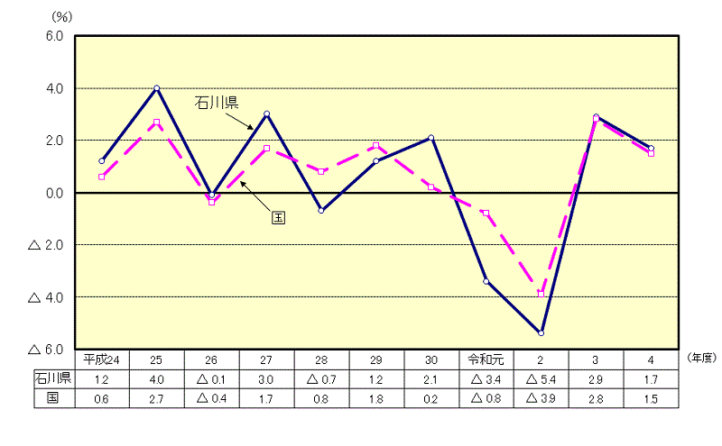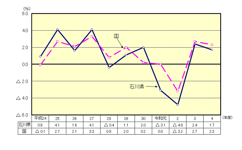 令和4年度の本県の経済成長率は、名目で1.7%増(前年度2.4%増)で、実質では1.7%増(同2.9%増)となり、名目、実質ともに2年連続でプラスとなった。
