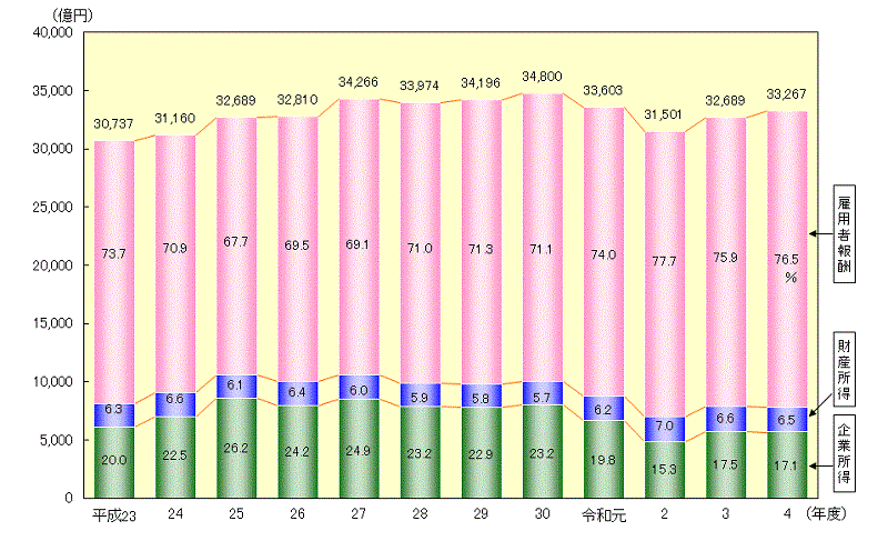 県民所得は、3兆3,267億円となり、前年度比1.8%増(同3.8%増)となった。