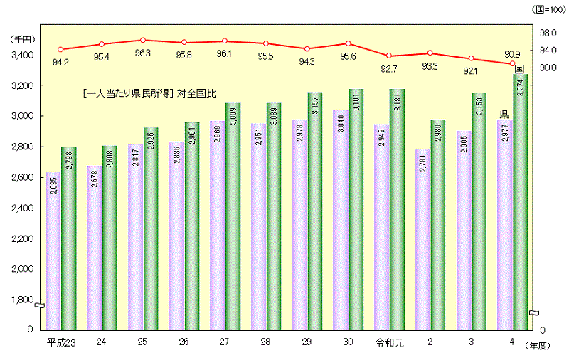 | 一人当たり県(国)民所得 | 実数 | 千円 | 2,905 | 2,977 | 3,153 | 3,274 |