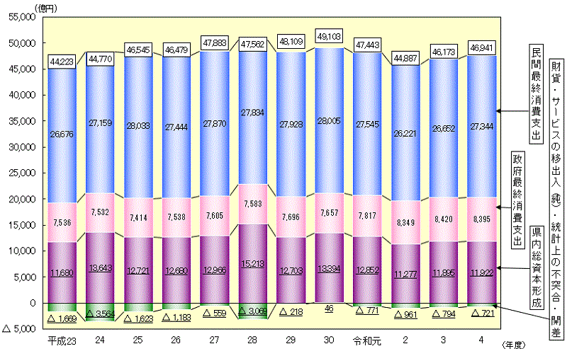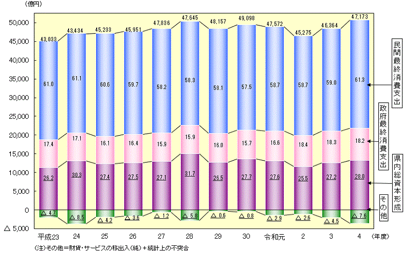 令和4年度の名目県内総生産(支出側)は、4兆7,173億円、前年度比1.7%増で、実質県内総生産(支出側)は、4兆6,941億円で、前年度比1.7%増となった。